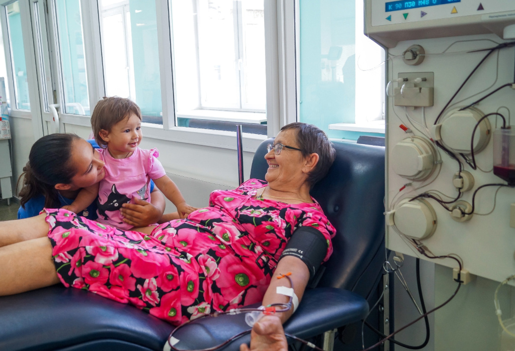 Маленькая правнучка Стефания с интересом наблюдала за процессом сдачи плазмы прабабушкой и поддерживала ее своей улыбкой.